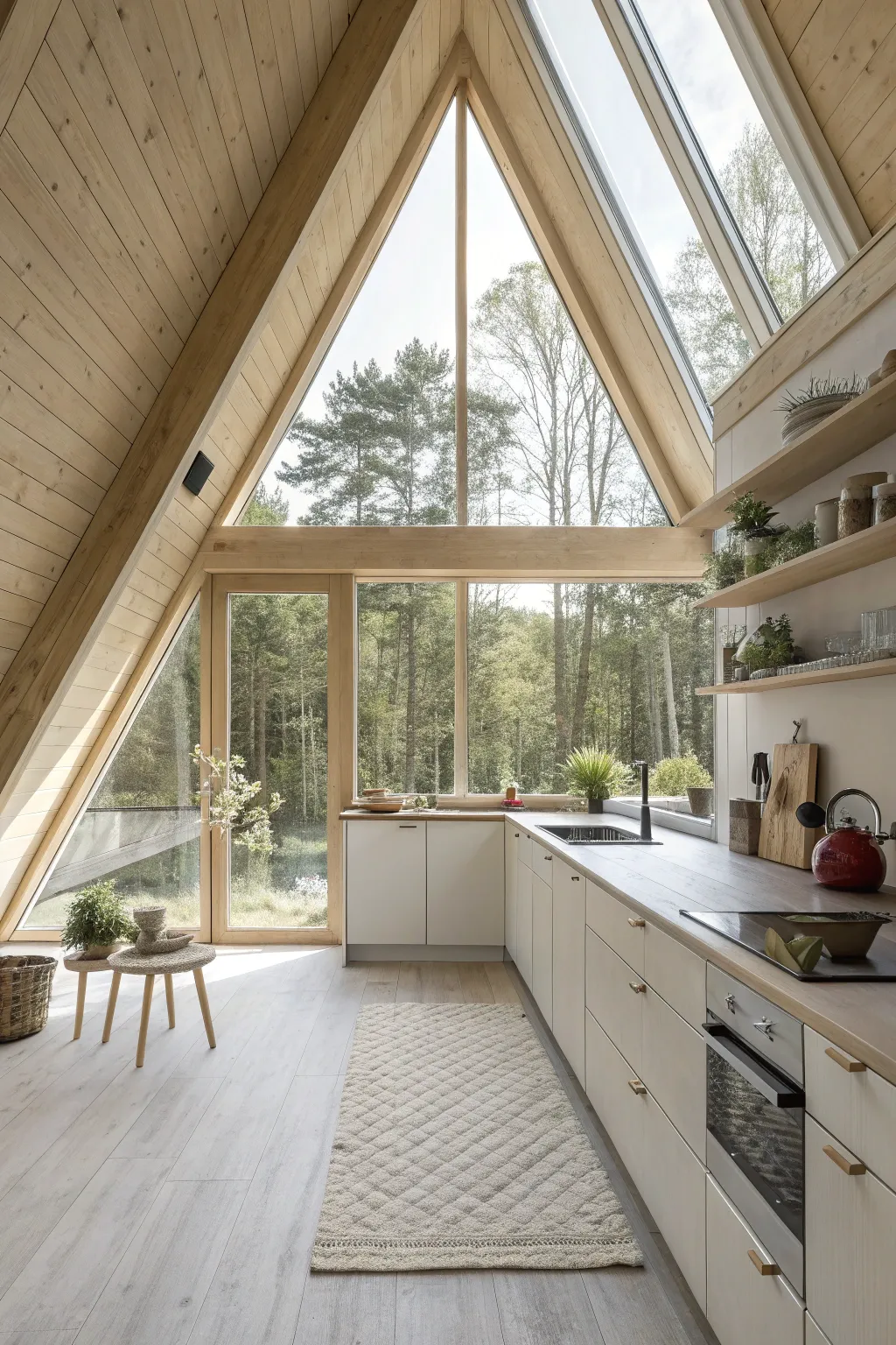 Large triangular windows are a hallmark of A-frame design, flooding your kitchen with natural light. Position your workspace to take full advantage of these luminous features.