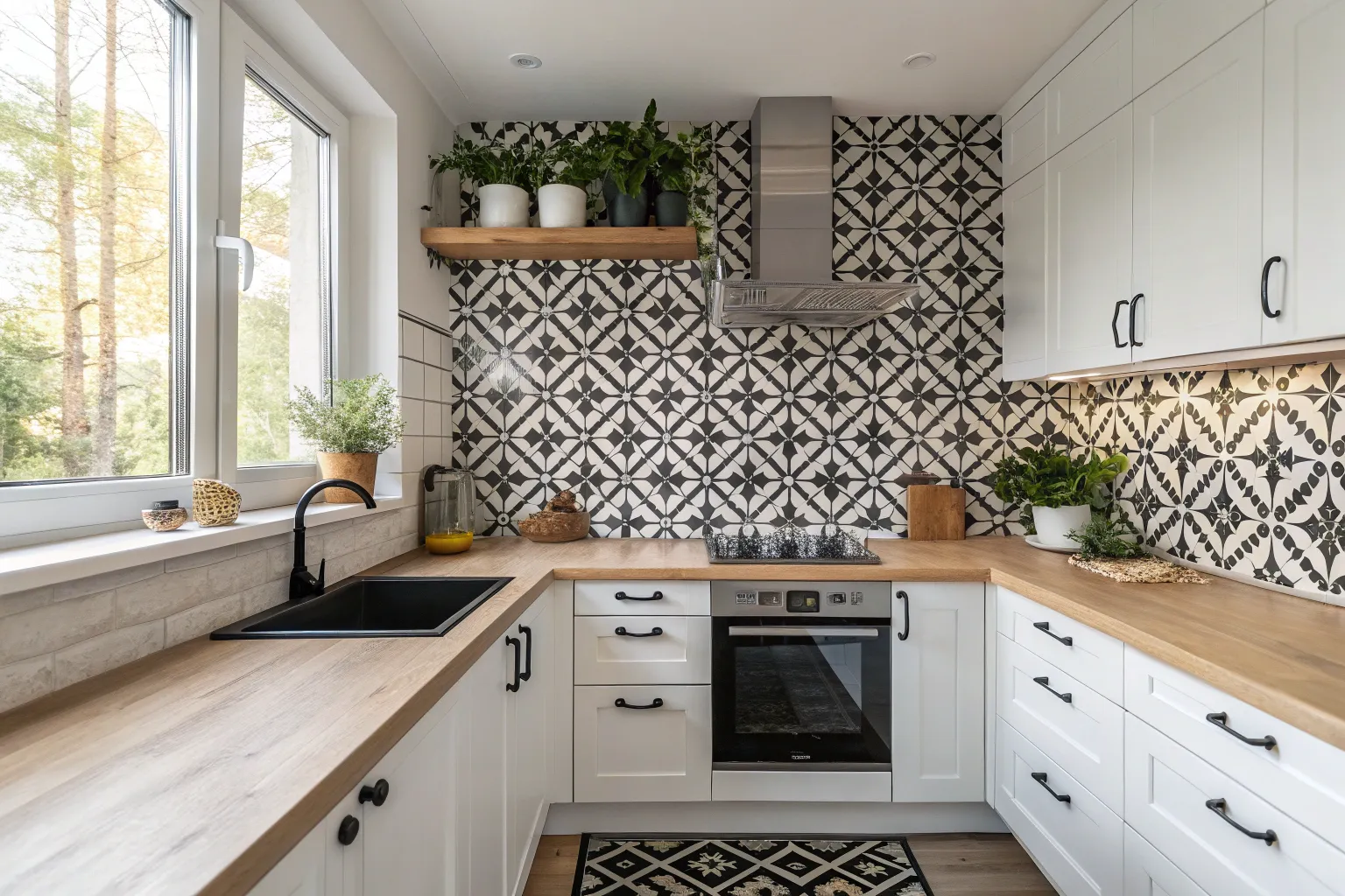 • Moroccan Style Black and White Tiles: Introduce an exotic touch with Moroccan-style tiles. Perfect for a striking kitchen update.