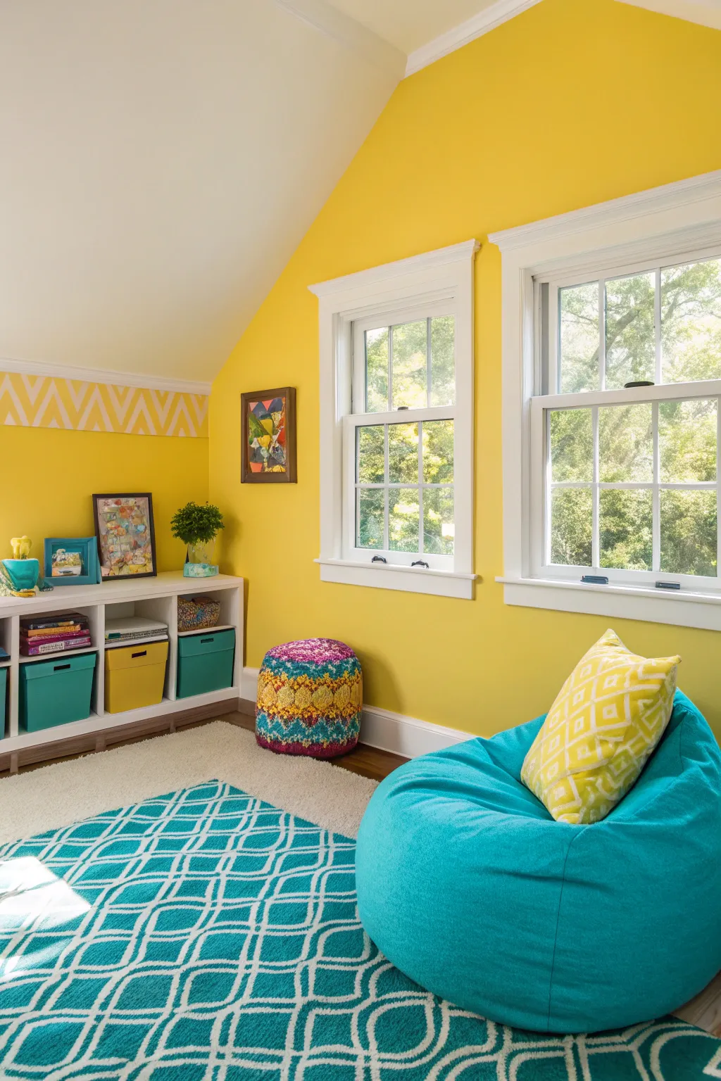 Inject a dose of happiness with sunny yellow paint. Perfect for a bonus room that serves as a creative or play space, it brings warmth and positivity.