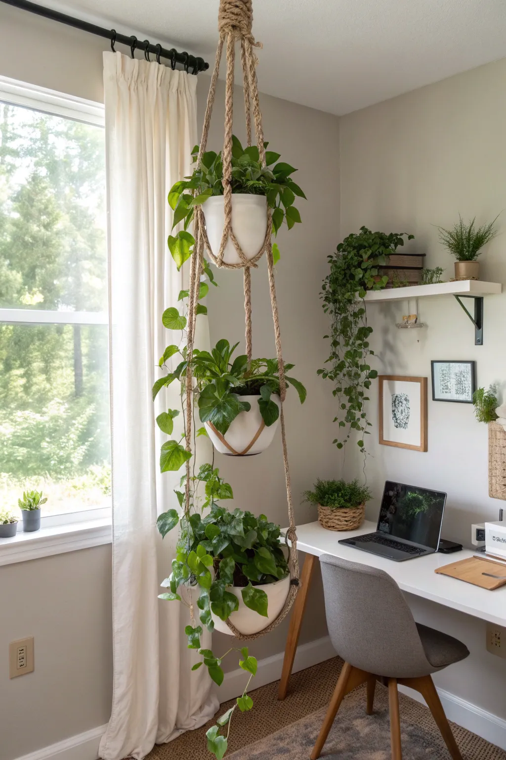 Hanging planters are perfect for adding greenery without sacrificing floor space. I’ve hung some in my home office to add life above my desk.