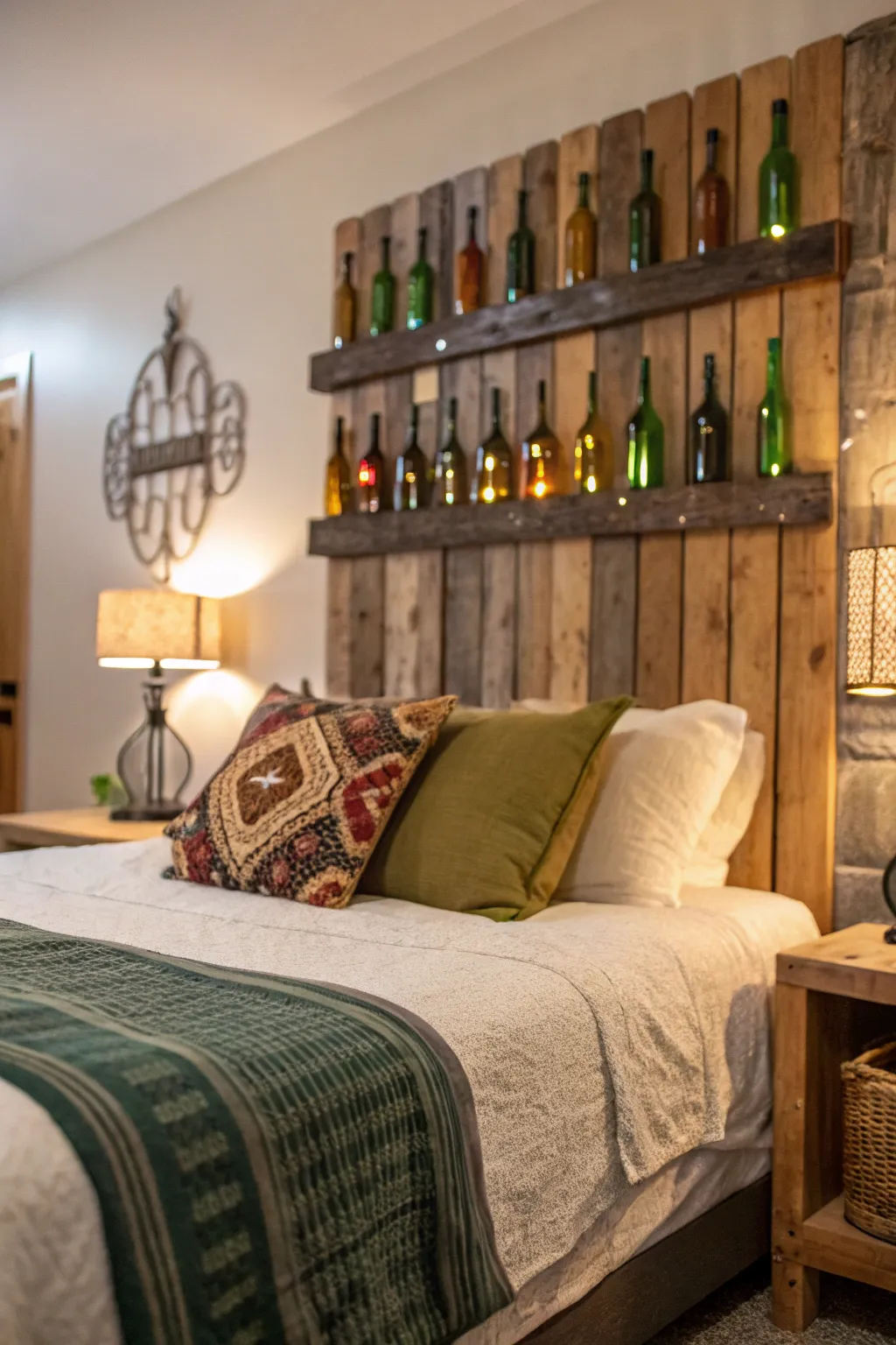 Transform your bedroom with a bottle wall headboard for an artistic flair. It’s a cozy and creative way to frame your bed.
