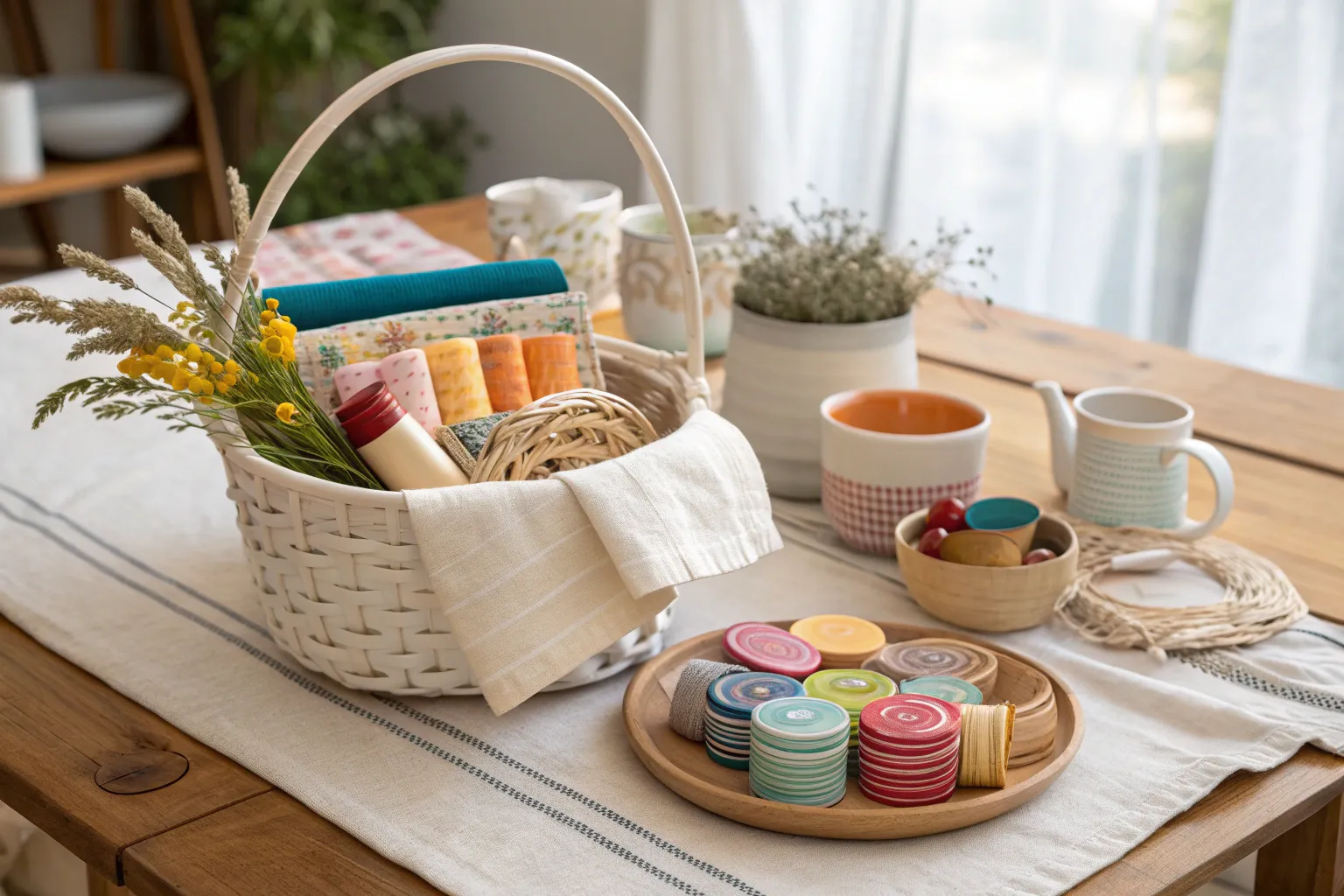 For a modern twist, a monochrome basket with sleek black and white items creates a chic and minimalist aesthetic.