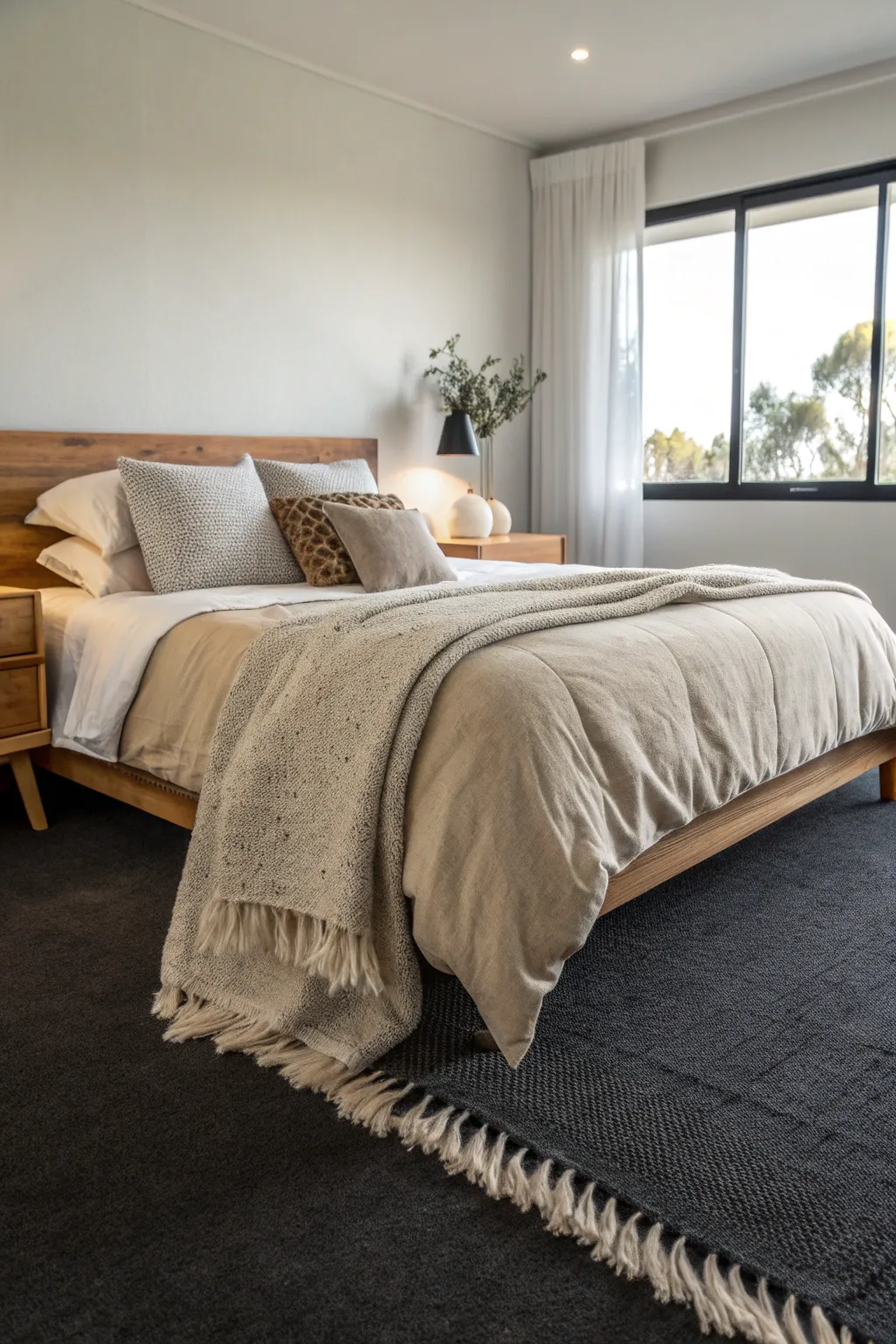 Textures like velvet or chunky knits can add depth and interest to a bedroom with a dark carpet. They play beautifully against the smoothness of the flooring.