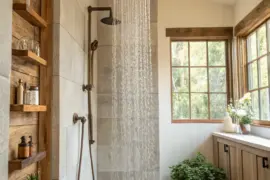 • Rustic Wooden Open Shelves: Add rustic charm with these wooden shelves, perfect for towels or decor. Organize in style!