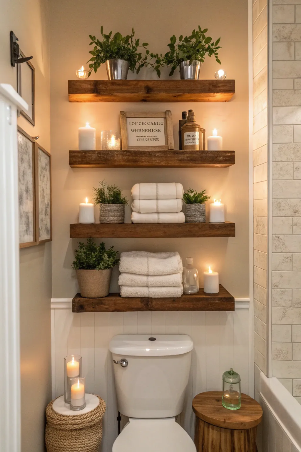 - Rustic Wooden Floating Shelves: Enhance your bathroom decor with rustic wooden shelves for warmth and style.