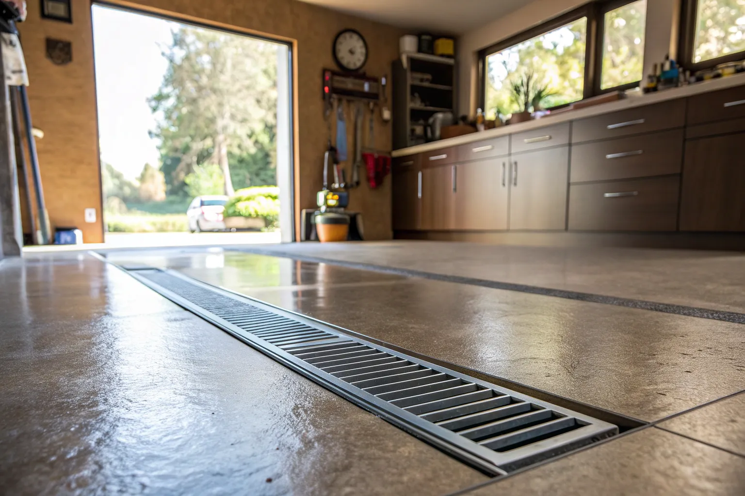 Stylish grated covers keep your garage drain efficient and clutter-free.