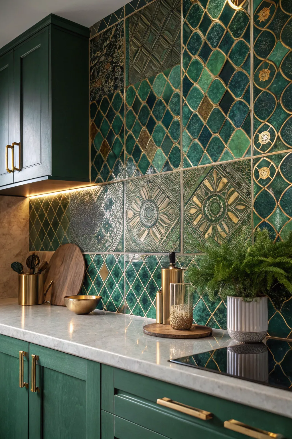 Patterned tiles incorporating multiple shades of green can make your backsplash the focal point. It’s a bold choice that pays off by adding an artistic flair to your kitchen.