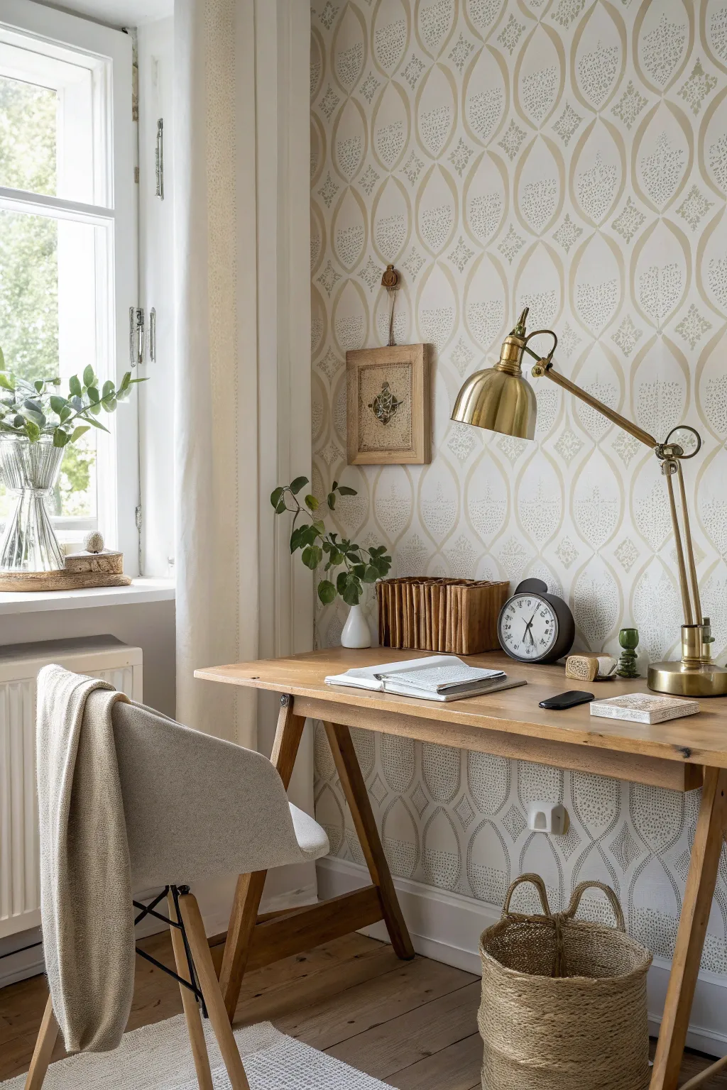 Embrace tranquility in your office with soft neutral wallpaper that promotes peace and focus.