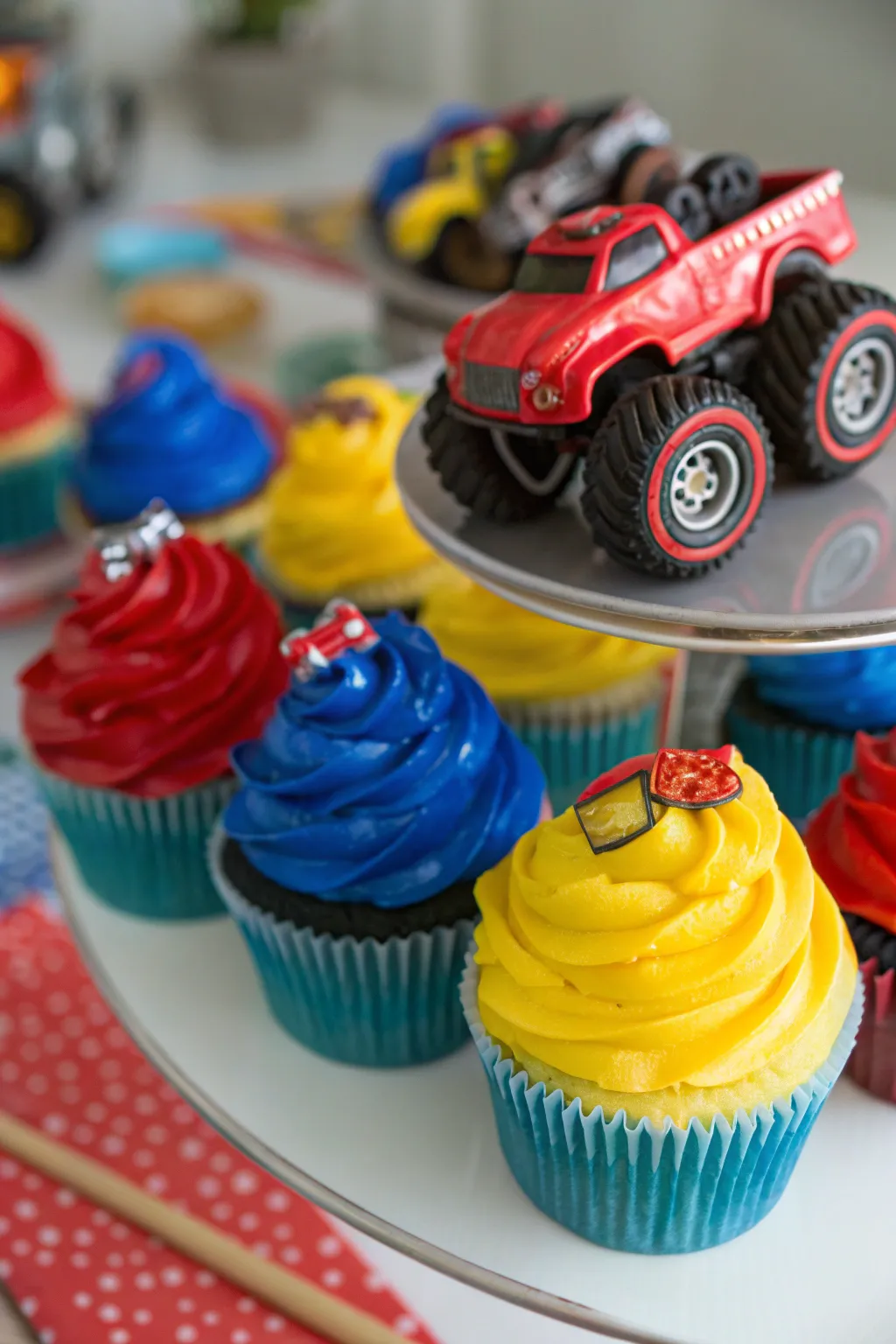 Dress up your cupcakes with monster truck-themed wrappers for a cohesive look. It’s a small detail that makes a big difference in presentation.