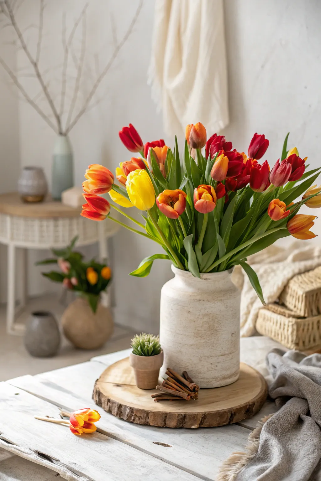 Mix pastel-colored tulips for a rainbow effect that brightens any space. This arrangement is my go-to for adding a soft, romantic vibe to bedrooms.